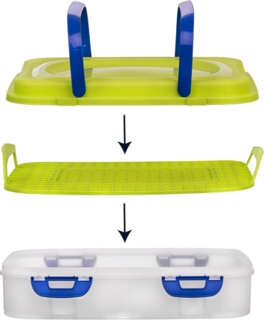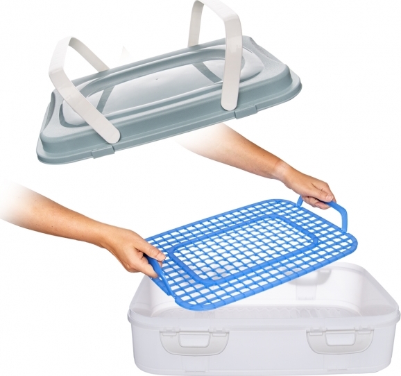 Sestava obsahuje plastovou mřížku s uchy, která ulehčují vyjímání obsahu a plastové víko se dvěma držadly, které umožňují pohodlné nošení boxu.