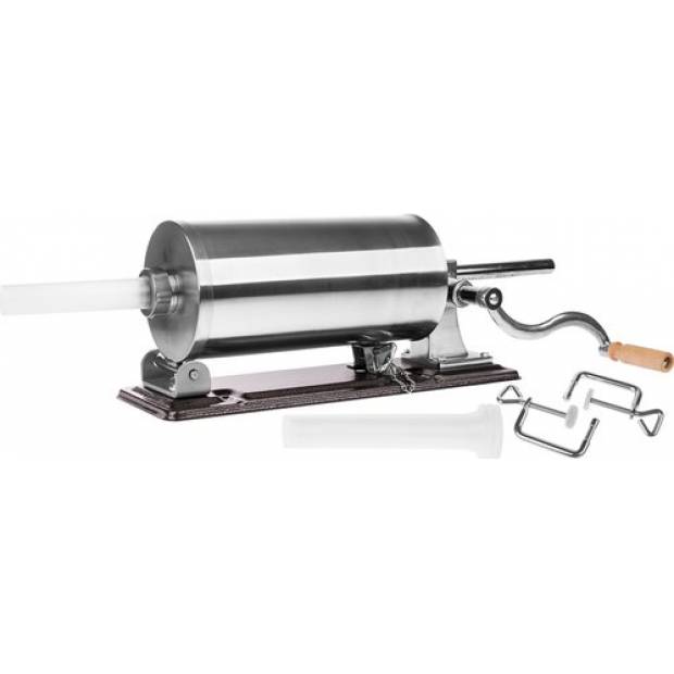 Ruční horizontální plnička klobás - určená k výrobě uzenin, ideální pro domácnosti a malé řeznictví. Díky tomu můžete snadno a rychle plnit klobásové střívka nádivkou. Výrobek je vybaven 4 nálevkami (s odvětrávacím systémem), které jsou pevně připevněny k ucpávce utaženým okrajem. Sada obsahuje odolný píst odolný proti ohybu pokrytý silikonem. Zajištění nitě měděným povlakem prodlužuje životnost ucpávky. Plnička je nenahraditelná při výrobě domácích klobás, uzenin a prejtů. Sada obsahuje: Stuffer, 4 trychtýře v různých velikostech: 14 mm, 18 mm, 21 mm, 25 mm, kroužek pro trychtýře, kliku, šroub pro připevnění klika, pevná přísavka pro montáž ucpávky na desku, návod k použití. Před každým použitím by měla být plnička důkladně omyta a na její vnitřní povrch natřena lžička oleje na vaření. To je nezbytné pro zajištění správné funkce pístu a pro prodloužení životnosti zařízení.
