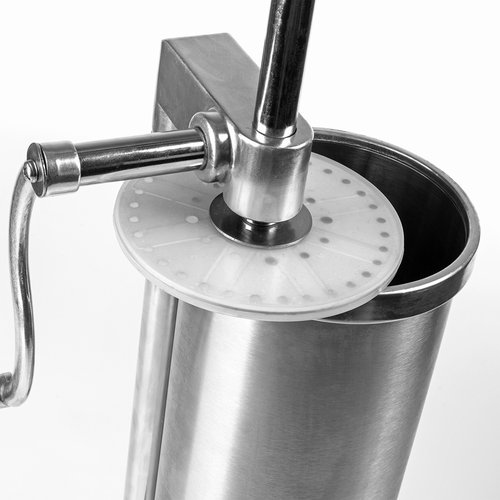 Ruční horizontální plnička klobás - určená k výrobě uzenin, ideální pro domácnosti a malé řeznictví. Díky tomu můžete snadno a rychle plnit klobásové střívka nádivkou. Výrobek je vybaven 6 nálevkami (s odvětrávacím systémem), které jsou pevně připevněny k ucpávce utaženým okrajem. Sada obsahuje odolný píst odolný proti ohybu pokrytý silikonem. Zajištění nitě měděným povlakem prodlužuje životnost ucpávky. Plnička je nenahraditelná při výrobě domácích klobás, uzenin a prejtů. Sada obsahuje: Stuffer, 6 trychtýřů v různých velikostech: 14 mm, 18 mm, 21 mm, 25 mm, 29 mm, a 35 mm. kroužek pro trychtýře, kliku, šroub pro připevnění kliky, pevná přísavka pro montáž ucpávky na desku,