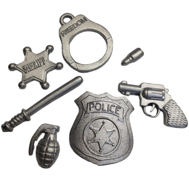 Policejní sada je perfektní dekorace pro všechny malé (i velké) fanoušky akčních hrdinů, policistů a dobrodružných příběhů. Každý kousek – od odznaku až po pistoli, pouta či obušek – je ručně modelovaný s obrovskou precizností, díky které figurky působí až překvapivě realisticky. Drobné detaily, přesné tvary a čisté linie dělají z této sady dekoraci, která promění obyčejný dort v dechberoucí oslavu.