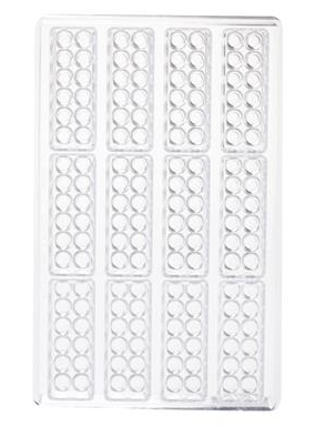 Pevná forma pro pralinky ve tvaru dětské  kostky. Vytvářejte přesné hrany a podrobné vzory dané čokolády. Při použití temperované čokolády vytváří na čokoládách zrcadlové povrchy. Vyrobeno z čirého polykarbonátu s hladkým povrchem pro snadné čištění. Polykarbonátová forma na čokoládu se nerozbije ani nezlomí. Je vhodná i pro použití na vroucí karamel.