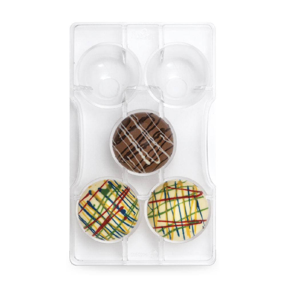Profesionální čokoládová forma z polykarbonátu od Decory pro snadn tvarování 3D výrobků z čokolády. Vytvarujte jednoduše polokoule, které pak slepíte k sobě, naplníte hračkou nebo náplní. Obsahuje 3 dutiny.