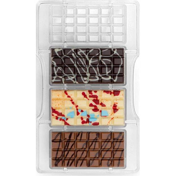 Polykarbonátová forma na čokoládu pro profesionální i domácí použití. Polykarbonát zajišťuje lesklý a dokonalý konečný výsledek. Čokoládu je třeba před nalitím do formy dobře temperovat. Formát tvaru: 200 x 120 x 20 mm, pro 4 ks tabulek o rozměrech 85 x 42 x 10 mm.