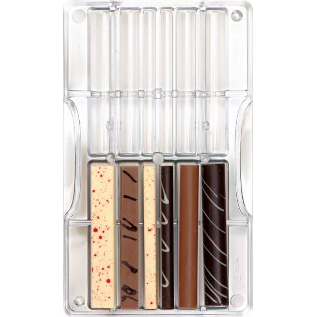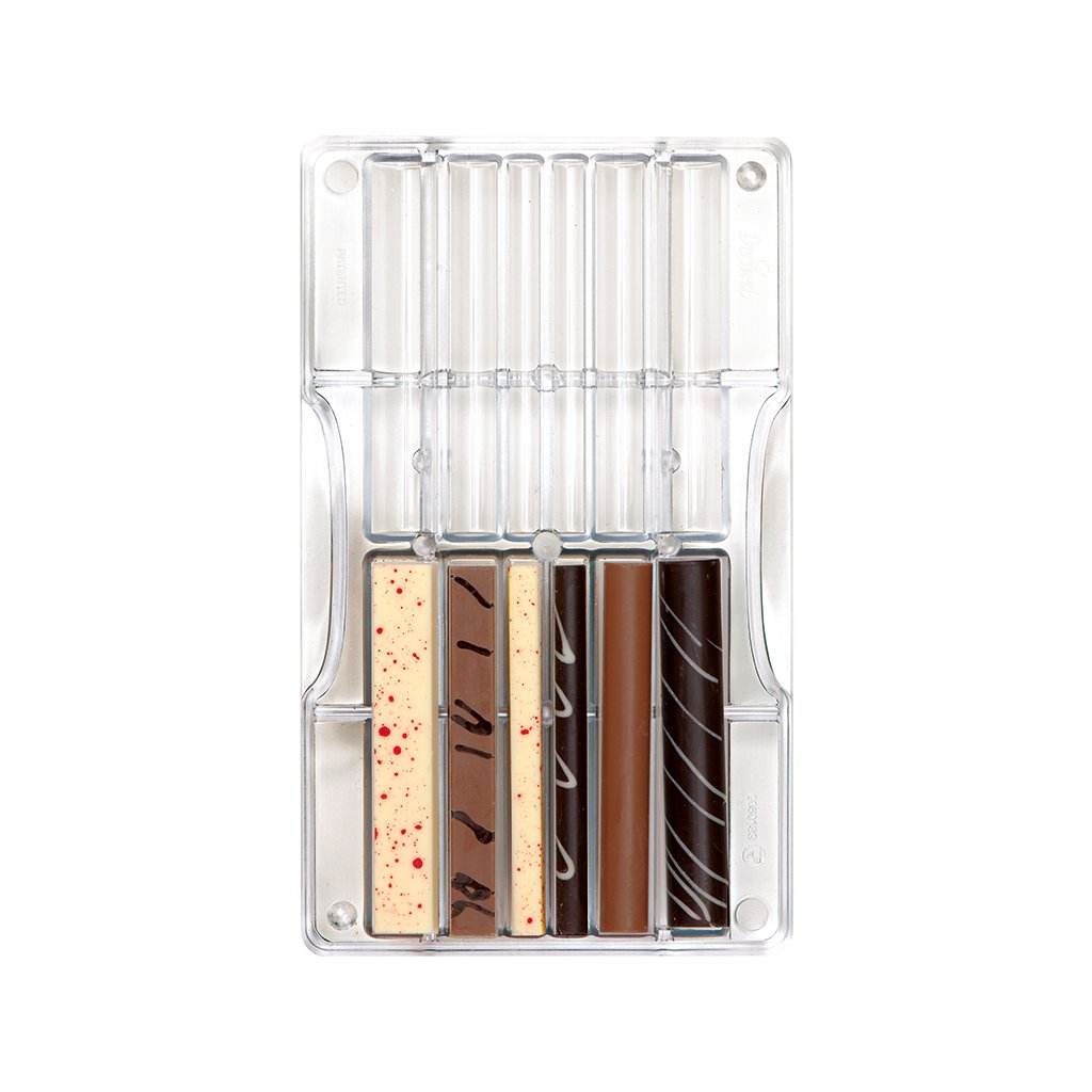 Polykarbonátová forma na čokoládu ve tvaru čokoládových tyčinek.