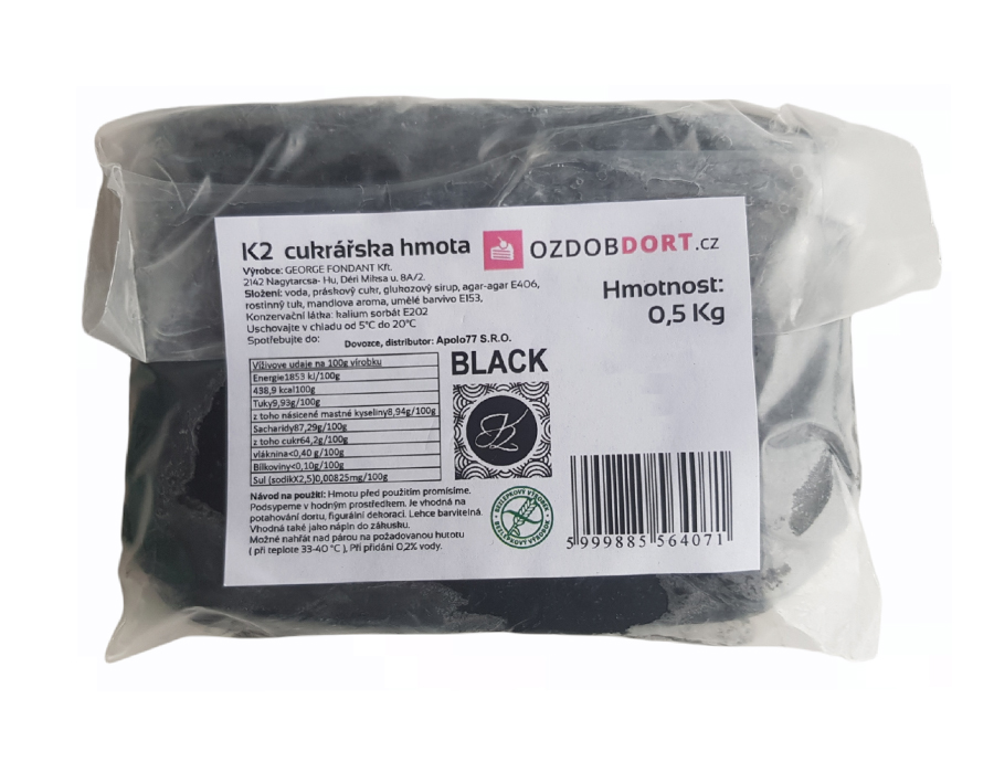 Kvalitní maďarská potahovací hmota s krásně černou barvou a příjemným mandlovým aroma. Je perfektní na potahování jakýchkoliv dortů, naopak se nehodí na modelování figurek a růží. Má naprosto perfektní vlastnosti. Lze ji použít okamžitě.