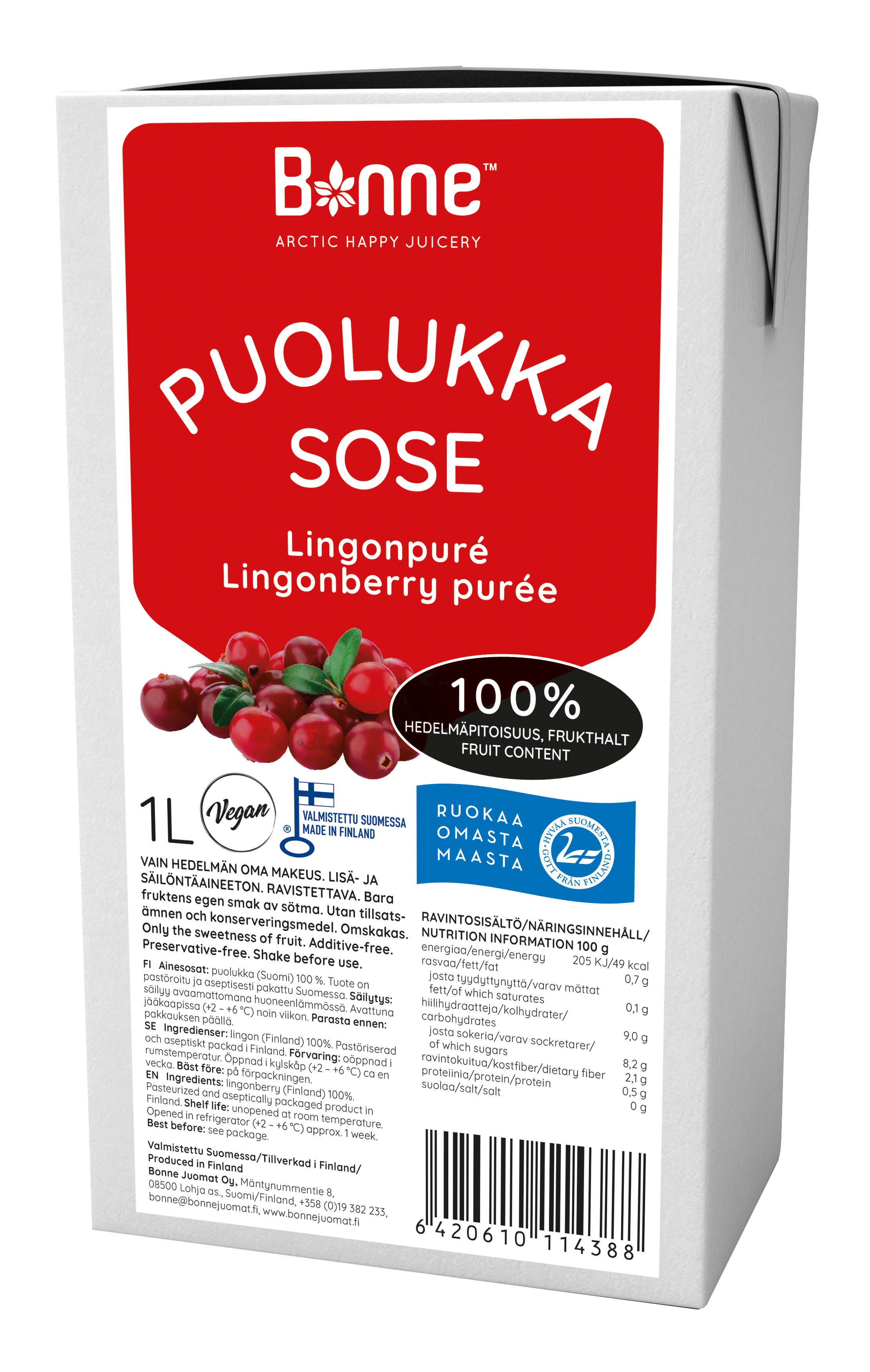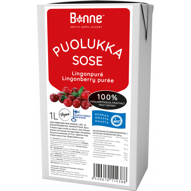 Brusinkové pyré Bonne má 100% podíl ovoce. Výrobek je neslazený, bez přísad a konzervantů a neobsahuje přidaný cukr. Pyré lze použít k výrobě: zmrzliny, smoothies, lassi, koktejlů, džusů, koktejlů, sorbetů a dortů. Produkt má dokonale hladkou konzistenci - bez slupek a semínek. Bonne Premium je jedinou značkou v této kategorii. Ovocné pyré Bonne Premium je připraveno k jídlu jako skvělá svačina nebo se dá přidat do kaše nebo jogurtu.Naše pyré vyrábíme a balíme ve finské Lohja. 100 % brusinka. Doba použitelnosti Neotevřené při pokojové teplotě do data minimální trvanlivosti, otevřeno v chladničce cca. 1 týden.