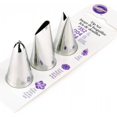 Sada tří trysek Wilton obsahuje:  Tip # 104: kovová tryska pro okvětní lístky, křivky, drapérie atd.  Tip # 352: kovová tryska pro realistické listy, ale také například skořápky.  Tip # 224: kovová tryska pro malé kapky s 5 body. Lze je mýt v myčce nádobí.