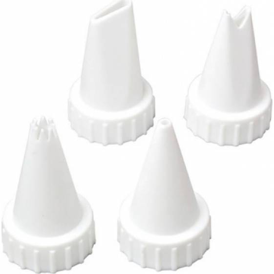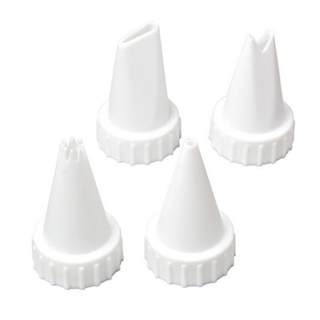 Tyto dekorační špičky se obvykle používají na různé typy krému. Sada obsahuje tipy Hvězda, Kolo, List a Okvětní lístek. Vyrobeno z plastu. V balení 4 ks. Vhodné pro myčku nádobí.