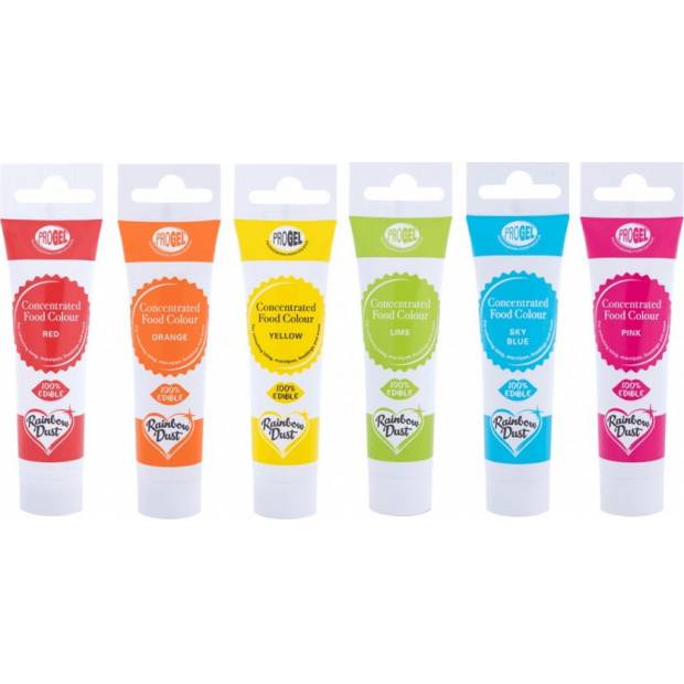 S gelovými barvami Rainbow Dust můžete obarvit svůj fondán, marcipán nebo máslový krém. Stačí malé množství potravinářského barviva, aby vaše výtvory získaly sytou barvu. Trubičky, které déle vydrží, jsou vhodné i k barvení piškotů, bonbonů a dalších. Každý gel je balen v barevně sladěné a čisté plastové tubě. Zkumavky obsahují pod šroubovacím uzávěrem plombu prokazatelnou neoprávněnou manipulaci. Jednoduše odloupněte a vytlačte gel z tuby. Už žádné špinavé nádoby, díky nimž bude vaše skříňka na nářadí plná barevných skvrn. Jak používat: gel přidejte do fondánu nebo marcipánu a hněťte, dokud se barva nespojí. Dobře prohněteme do požadované barvy. Nyní je barevný fondán nebo marcipán připraven k použití na vašem dortu! Doporučené dávkování je 3 gramy na kilogram hotového výrobku.