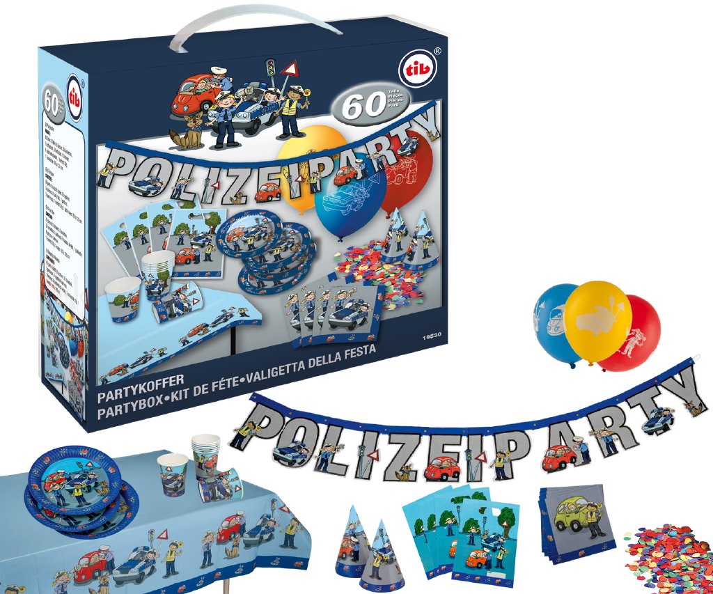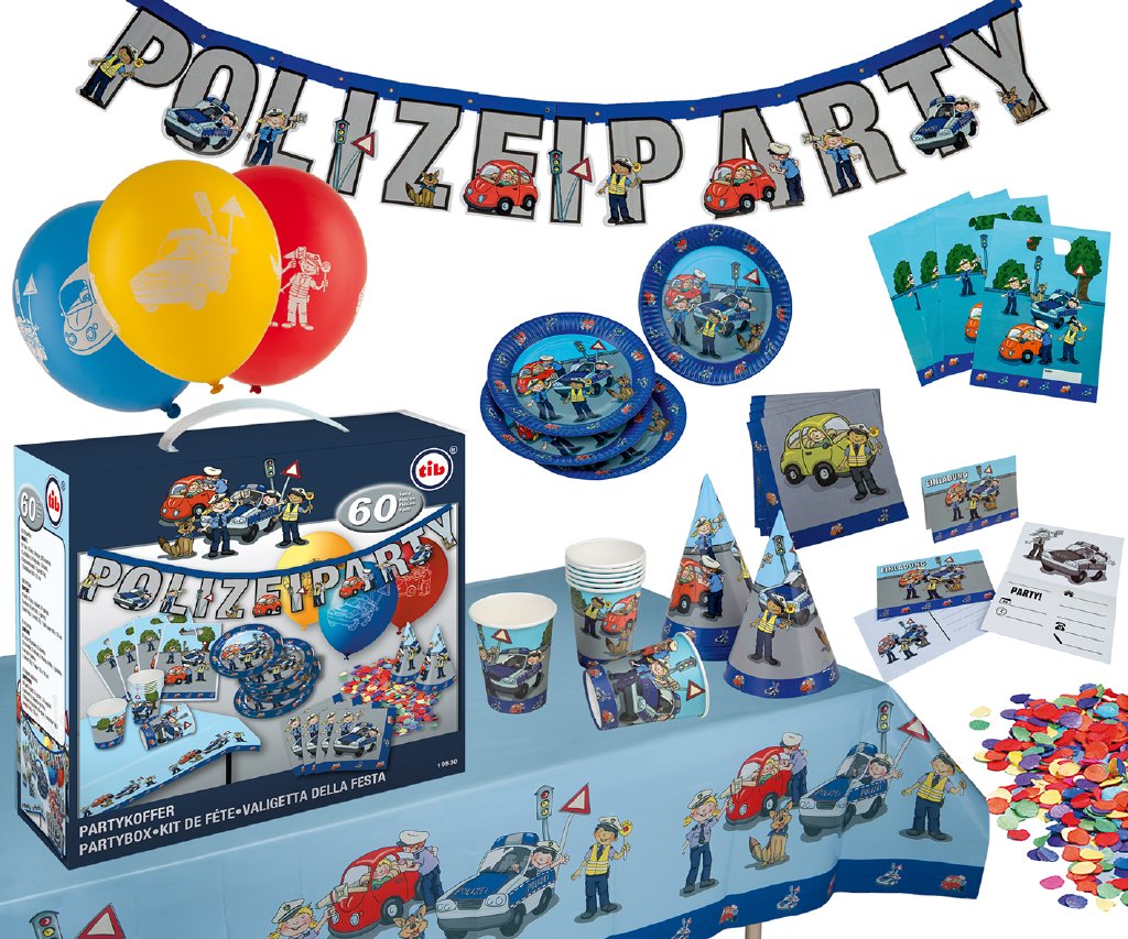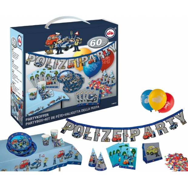 Párty set s motivem policie je svými 60 díly určen pro 8 malých hasičů. Součástí dodávky je 8 papírových kelímků a papírových talířků, 20 ubrousek, 8 společenských klobouků, 5 potištěných balónků, girlanda, 8 dárkových sáčků k naplnění, balení barevných konfet (cca 10 g) a ubrus (cca. 180 x 120 cm). Motiv přirozeně zobrazuje odvážné policisty v akci.