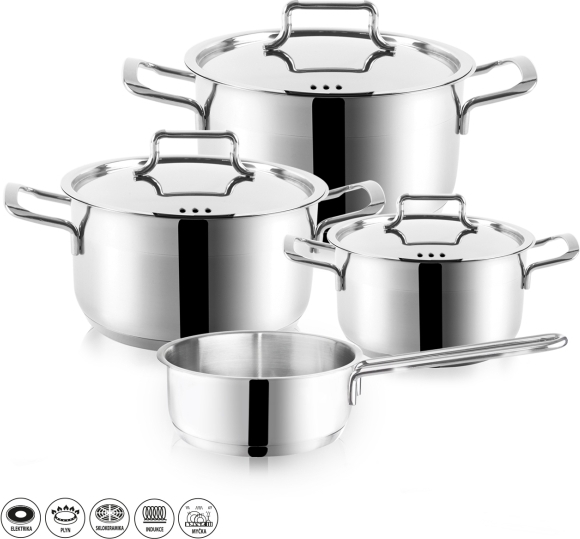 Sada nádobí s poklicí s otvory pro únik páry - kastrol 4,3 l, pr. 22 cm, v. 12 cm, kastrol 3 l, pr. 20 cm, v. 10 cm, kastrol 1,9 l, pr. 16 cm, v. 10 cm a rendlík bez poklice 1,9 l, pr. 16 cm, v. 10 cm. Nerezové kastroly a hrnce představují díky používaným technologiím a kvalitním materiálům výrobek vhodný pro každou moderní domácnost a jsou ideální cestou ke zdravé výživě, dietní, ekonomické a estetické přípravě pokrmů. Nabízené nádoby jsou vyrobeny z vysoce kvalitní nerezové oceli třídy 304. Naakumulovaná energie předává teplo dále do nádoby – tepelný zdroj vypínáme v předstihu. Nádobí lze používat na všechny typy spotřebičů i do trouby. Vhodné i do myčky nádobí. – fritování, napařování, vaření s minimálním množstvím tuku, bez ztráty vitamínů a minerálů obsažených v potravinách - nádobí představuje dokonale hygienické prostředí pro vaření a uchování potravin- zachování přirozené chuti a hmotnosti upravovaných potravin- vnější a vnitřní povrch nádob je vysoce leštěný, takže brání usazování nečistot a zaručuje dokonalou údržbu.