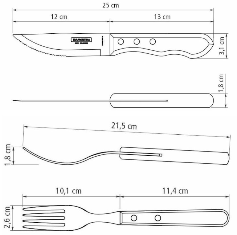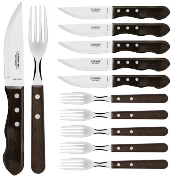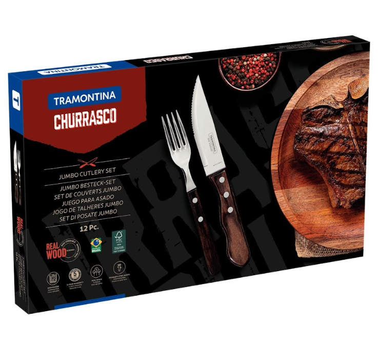 Robustní steaková sada Tramontina JUMBO Polywood spojuje brazilskou tradici od roku 1911, ostré nerezové čepele a odolné dřevěné rukojeti, které bez obav zvládnou i myčku.