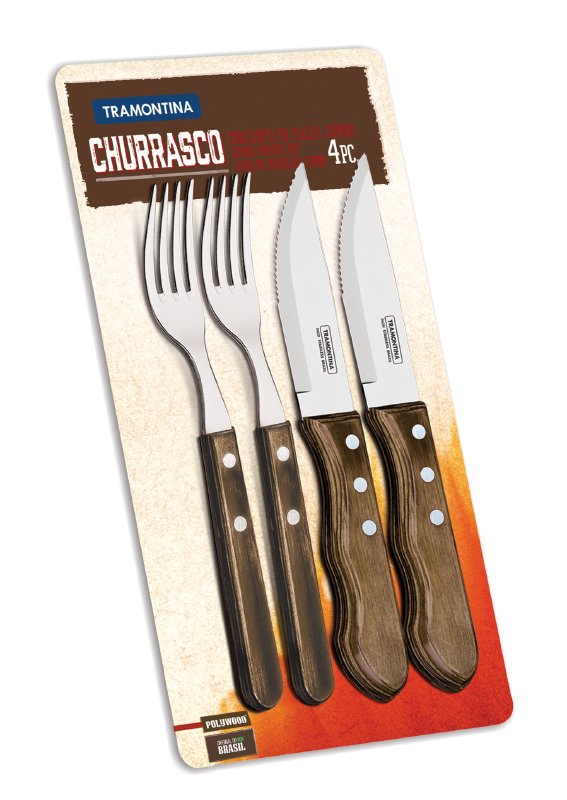Grilování je oblíbenou kratochvílí po celém světě. Brazilská firma Tramontina nabízí 4-dílné příbory z kvalitních materiálů, takže šťavnaté grilované jídlo lze také stylově krájet. Extrémně tvrdá čepel vyrobená z nerezové oceli (AISI 420, odpovídá DIN 1.4028) zaujme svojí dlouhou hranou. Rukojeti nože i vidličky jsou vyrobeny ze speciálního dřeva. Toto dřevo, vyrobené z několika vrstev borovicového dřeva impregnovaného a lisovaného pryskyřicí, je mimořádně odolné, odolné vůči nárazům, necitlivé na teplotu a bezpečné do myčky. I po častém používání vypadá sada příborů na grilování elegantní a nová.