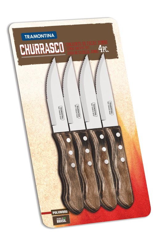 Neznáme nic hezčího, než sedět spolu v uvolněné atmosféře a užívat si grilování chutného masa. Společnost TRAMONTINA nabízí správné krájecí nástroje, aby bylo možné stylově krájet i šťavnaté kousky masa. Čtyřdílná sada nožů na jumbo steaky vyrobená z nerezové oceli AISI 420 (odpovídá DIN 1.4028) je vyrobena ze zvláště tvrdé oceli a díky své délce zaujme. Robustní rukojeti vyrobené ze skutečného dřeva jsou odolné proti nárazům, vysokým teplotám a také umožňují čištění v myčce na nádobí. Rukojeti se skládají z několika vrstev borovicového dřeva, které jsou napuštěny pryskyřicí, lisovány, řezány a leštěny. Nože mají 12,5 cm dlouhou čepel. Jsou baleny v blistru.