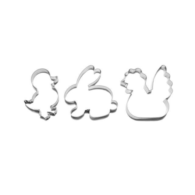 Ostrá hrana vykrajovátek je zárukou vždy dokonale vykrojeného tvaru, ze všech druhů těst. Sada obsahuje tyto vykrajovátka: kuřátko, zajíček a slepička. Velikost vykrajovátek: 59-70 mm. Výška plechu je 16 mm. Vykrajovátka jsou vyrobena z pocínovaného plechu.
