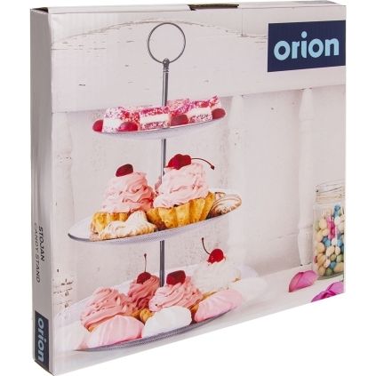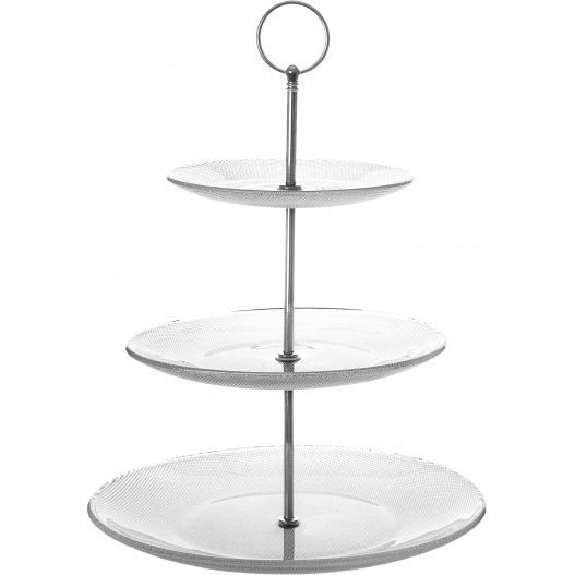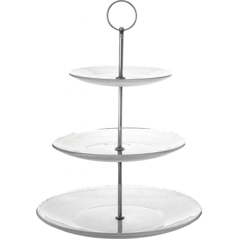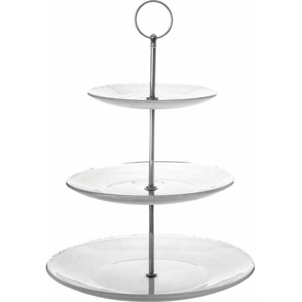 Stojan 3 patrový kulatý na servírování zákusků, cukroví, ovoce, jednohubek, chlebíčků. Materiál: sklo, kov. Rozměry: pr. 15/20/25 cm, v. 33 cm.