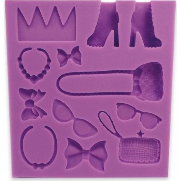 Tato nová sada forem na příslušenství od Sweet Revolutions umožňuje snadné vytváření roztomilých doplňků pro vaše figurky a modely dortů. Sada příslušenství zahrnuje: Koruna, boty, kabelka, mašle, sluneční brýle, náhrdelník a kabelka. Formy jsou univerzální a lze je použít s jakoukoli kvalitní modelovací pastou nebo cukrovou pastou. Může být také použit s květinovou pastou, modelovací čokoládou a marcipánem. Každá forma je vyrobena z vysoce kvalitního potravinářského silikonu, speciálně navrženého pro pomoc při výrobě bezchybných dortových dekorací.