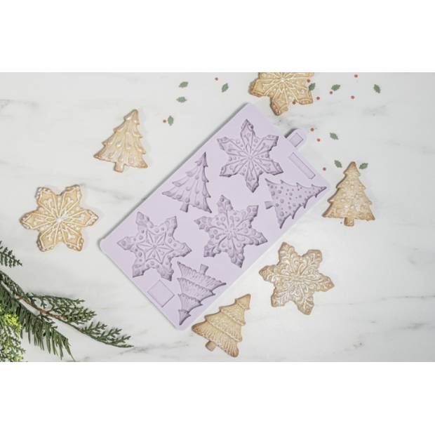 Vytvořte krásné sněhové vločky a vánoční stromky rychle a snadno pomocí silikonové formy Karen Davies Snowflakes & Christmas Trees. Forma obsahuje tři různé velikosti sněhových vloček a vánočních stromků. K ozdobení košíčků, sušenek a dortů použijte fondán, marcipán, cukrovou pastu, těsto na sušenky a další. Ideální na vánoční večírky a vánoční večeře! Formy Karen Davies jsou detailní, flexibilní a vyrobené z vysoce kvalitního silikonu. Návod: Marcipán nebo fondán dobře prohněteme. V případě potřeby smíchejte fondán s trochou tylo prášku. Udělejte kuličku a marcipán nebo fondán zevnitř ven dobře vtlačte do formy. Poté tvar vyjměte z formy. Pokud je to nutné, poprašte formu předem trochou kukuřičného škrobu, aby se fondán/marcipán snadno dostal z formy. Před použitím formu důkladně omyjte a osušte. Lze použít na cukrovou pastu, květinovou pastu, těsto na sušenky, pečivo, marcipán, modelovací pastu, čokoládu, cukroví, vařený cukr, slané těsto, jíly schnoucí na vzduchu, studený porcelán a embosovací prášek. Rozměr formy: 21 x 12 cm.