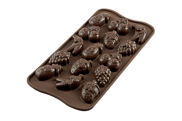 Forma na přípravu krásně zdobených bonbonků ve tvaru veselého ovoce je velmi pružná a nepřilnavá, takže z ní čokoládky vždy snadno vyloupnete. Pro inspiraci najdete v sadě i recept na přípravu čokoládových pralinek. Rozměry jednotlivých bonbonků jsou: ananas 38 x 22 x 15 mm, jahoda 35 x 25 x 15 mm, hrozno 35 x 23 x 15 mm, třešně 36 x 31 x 15 mm, banán 40 x 27 x 15 mm. Objem formy je 91,2 ml.