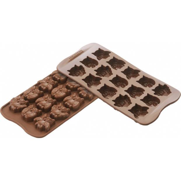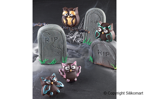 Forma obsahuje čtyři druhy buclatých soviček. Rozměr jednoho bonbonu je 3,4 x 3 x 1,5 cm. Rozpuštěnou čokoládou naplňte formu, přebytek setřete stěrkou a formou poklepejte o pracovní desku, aby v čokoládě nebyly bublinky. Čokoládky dejte ztuhnout do chladu (forma vydrží teploty do -60°C).Formička je velmi pružná a nepřilnavá, bonbonky se z ní díky tomu snadno vyloupávají.