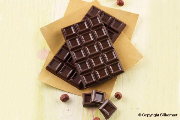 Pružná a nepřilnavá forma na výrobu tabulky čokolády se čtverečky s vyvýšeným okrajem.