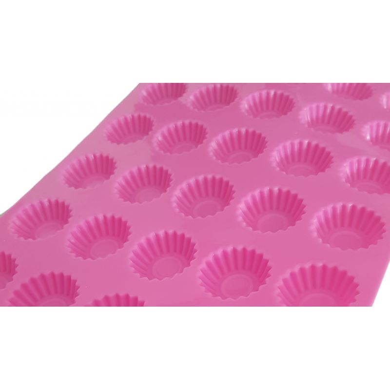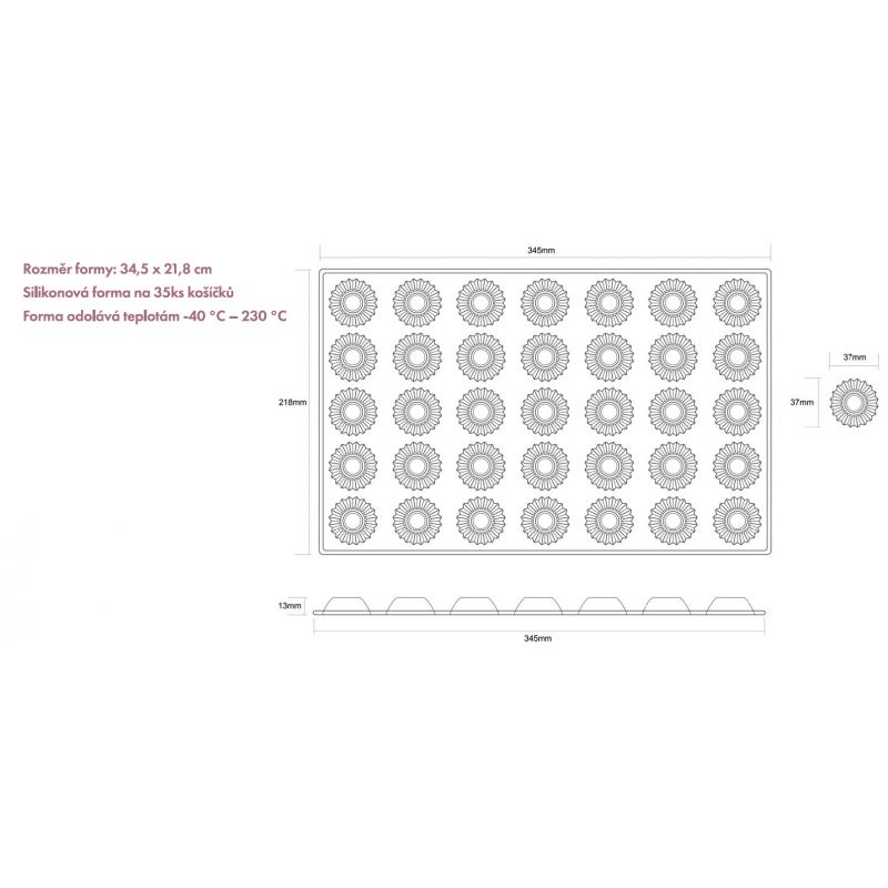 Forma na pečení mini košíčků je naprostou novinkou na trhu. Forma má rozměr zhruba 34,5 x 21,8cm. Jednotlivý košíček má vrchní průměr 37mm a hloubku 13mm, dno košíčků má průměr zhruba 28mm. Na formě je 35ks košíčků stejné velikosti. Forma je celá ze silikonu, odolá tedy teplotám -40C a +230C, výrobce uvádí přímo na formě teploty i o něco vyšší. Nicméně se tedy v této silikonové formě na košíčky, může nejen péct, ale i mrazit, použít jí lze třeba na čokoládové bonbóny, želatinu, popřípadě Isomalt. Uplatnění tedy najde všude tam, kde tvar mini košíčku využijete a to třeba i ve slané kuchyni. Při pečení je dobré formu položit na rovný plech. Před použitím je dobré formu prolít vodou – voda se během pečení odpaří a tím se stane forma nepřilnavou. Na formu nepoužívejte ostré předměty, mohla by se poškodit proříznutím. Košíčky se nepečou pouze na Vánoce či Velikonoce, určitě Vám ulehčí práci i při pečení svatebních košíčků, popřípadě jsou skvělé, jako jednohubky na oslavu či venkovní párty. Tuto silikonovou formu ve tvaru mini košíčků si zamiluje opravdu každý, skvěle se s ní pracuje, navíc i krásně vypadá – její růžová barvička je nepřehlédnutelná a jistě se bude líbit každé hospodyňce.