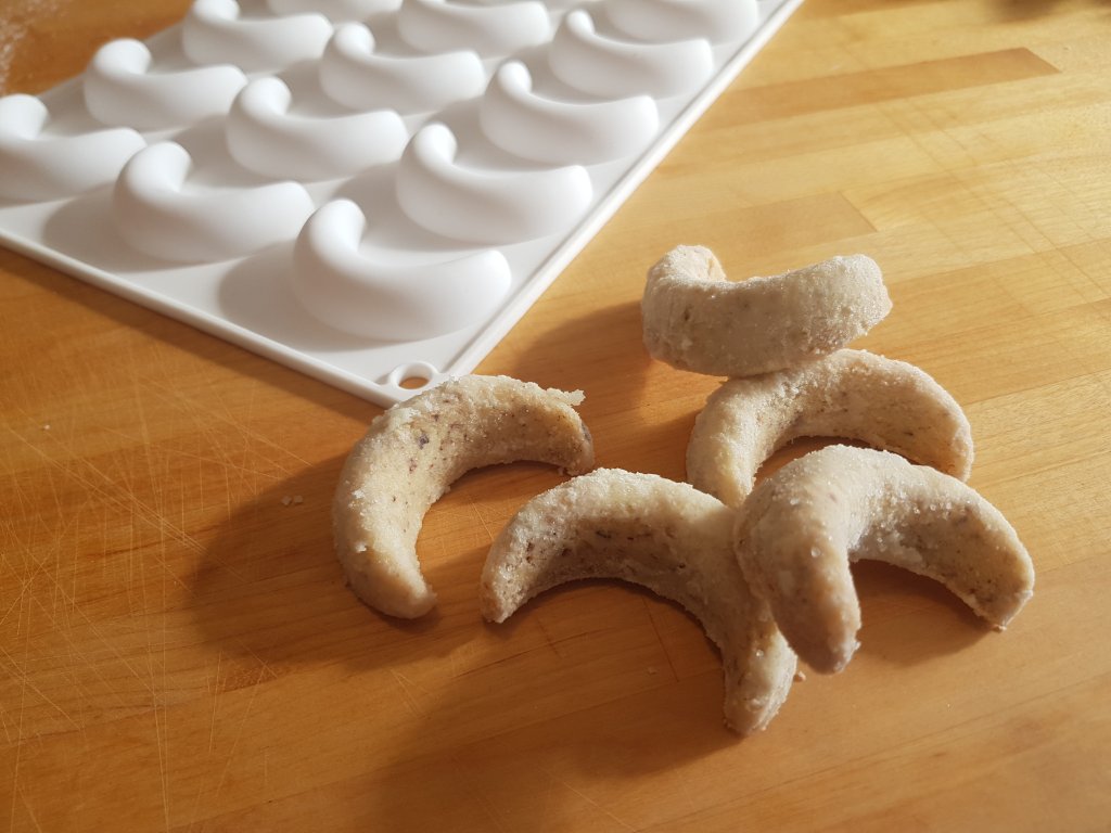 Silikonová forma na pečení například tolik oblíbených Vanilkových rohlíčků, je oblíbenou formou z mnoha důvodů. Tím hlavním je nepřilnavost těsta, stačí vždy před každým použitím, prolít formu vodou, tím se stane nepřilnavou a odpadá tak klasické bouchání formičkou o stůl. Každý rohlíček z této silikonové formy doslova sklouzne pryč. Rozměr celé formy je cca 28,5x19,4cm. Na formě je 18ks rohlíčků o velikosti přibližně 5,5cm. Silikonová forma vydrží jakoukoli teplotu a to od -30C do +220C. Nesmí se používat s ostrými předměty, forma by se mohla poškodit/proříznout. Foto na krabici je pouze ilustrační. Recept a jak si připravit chutné a tolik oblíbené Vanilkové rohlíčky, najdete na krabici výrobku i zde v popisu. Recept na Vanilkové rohlíčky Na těsto budeme potřebovat: 70g Moučkového cukru 120g Mletých ořechů 300g Hladké mouky 230g Změklého másla Na obalení budeme potřebovat: 100g Moučkového cukru 20g Vanilkového cukru Suroviny smícháme v hladké, nelepivé těsto. To obalíme v potravinářské fólii a necháme 30 minut v chladničce. Mezitím smícháme Moučkový a Vanilkový cukr v hlubší a širší misce. Silikonovou formu prolijeme vodou, nejlépe pod tekoucím kohoutkem. Ideální je, pokud pár kapek vody zůstane na formě, formu nijak nevysoušíme. Vzniklé těsto natlačíme do silikonové formy na rohlíčky a pečeme v předehřáté troubě 10 minut při 170C. Tak aby byl každý rohlíček do zlatova upečený. Po vyjmutí z trouby vyklepeme rohlíčky a každý, ještě teplý obalujeme ve vzniklé směsi cukru. Uchováváme nejlépe v papírové krabici v suchu a chladu.