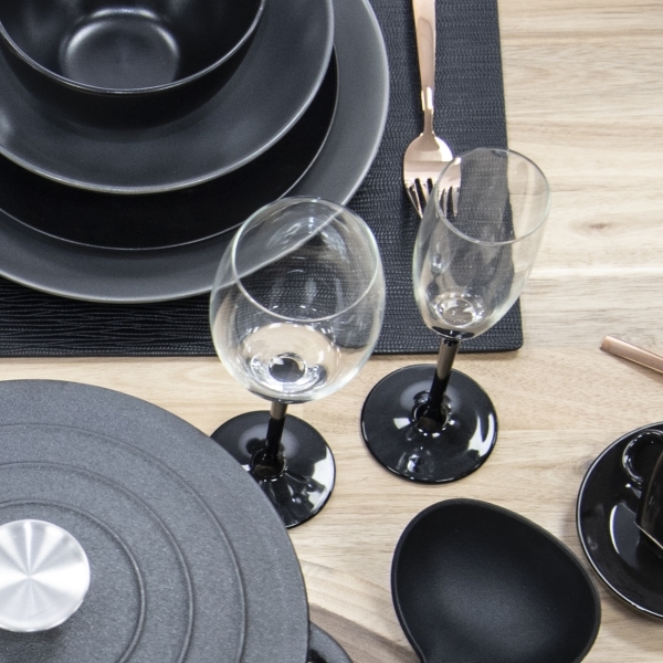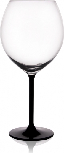 Plný kalich je posazen na dlouhé nožce z černého skla, díky které se sklenice plněná cca do 2/3 objemu dobře drží a víno od rukou tolik neteplá.