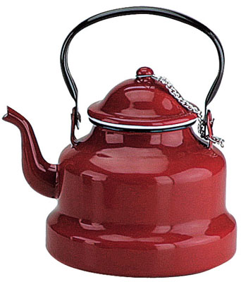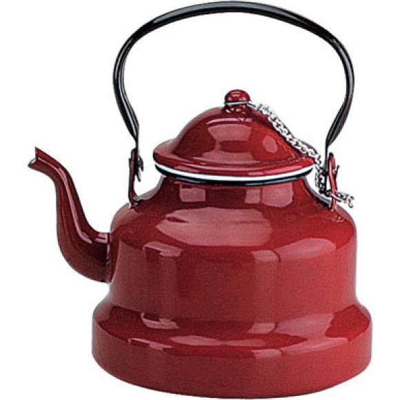 Červený retro čajník má víko přidělané řetízkem a držadlo na horní části. Je vyrobený z kovu se smaltovaným povrchem. Vhodný na servírování. Lze použít na plynový ohřívač a mýt v myčce na nádobí.
