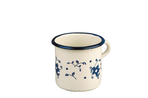 Hrnky a další produkty ze smaltu se opět vrací, ale ty současné jsou vzhledem k používání nových materiálů a technologií mnohem kvalitnější a tak budete zcela jistě spokojeni i s tímto hrnkem. Má klasický tvar, jeho obsah je 4 decilitry a na povrchu má jemný květinový dekor.