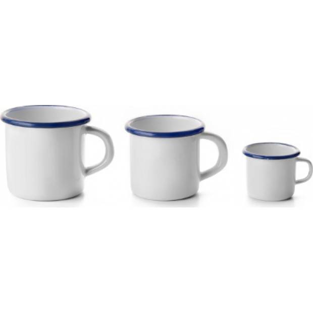 Praktický hrníček s povrchem z kvalitního smaltu bílé barvy s efektní modrou linkou. Může se použít na všechny známé typy ohřevu i do pečící trouby a mýt v myčce nádobí.