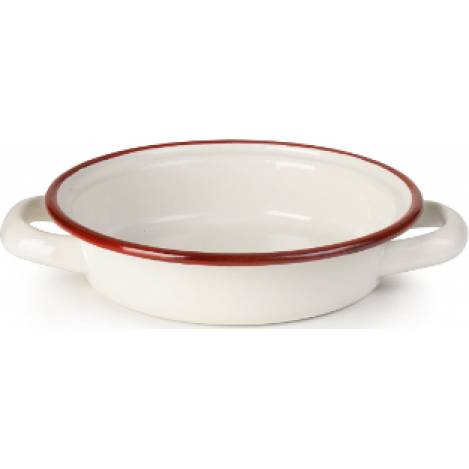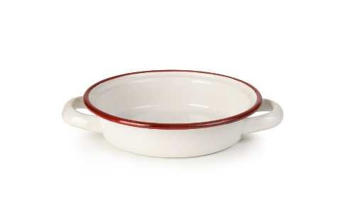 Mini oválný kastrůlek s uchy bílé barvy s červeným okrajem.