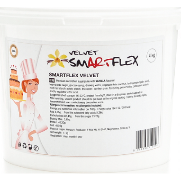 Potahovací a modelovací hmota bílé barvy s příjemným vanilkovým aroma. Nelepí se, je velmi pružná i perfektně drží tvar a proto je vynikající na modelování větších jedlých dekorací i potahování na dortový korpus. Hmota je sněhově bílá a může se barvit potravinářskými barvami do různých odstínů. Větší ekonomicky výhodné balení je vhodné především pro profesionální použití.