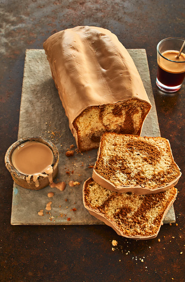 Pečící směs, měkký margarín nebo máslo, vejce a mléko dáme do mixovací nádoby a mícháme elektrickým ručním mixérem (šlehací metlou) nejprve krátce na nejnižší rychlost, poté na nejvyšší rychlost asi 3 minuty do krémova. Pečení: Formu (asi 25 cm) vymažeme tukem a moukou, vlijeme do 2/3 těsta. Do zbylého těsta vmícháme karamelovou směs a 1 lžíci mléka. Tmavé karamelové těsto rozetřeme na světlé. Pomocí vidličky spirálovitě protáhněte obě vrstvy těsta, abyste vytvořili mramorovanou texturu. Koláč pečeme v