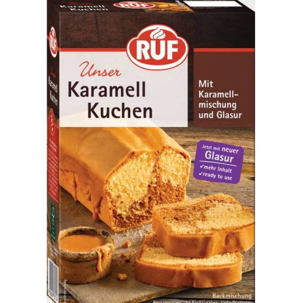 Náš karamelový dort RUF se opravdu trefil na místo: tento chutný bochník v trendové karamelové příchuti je tím nejlepším na trhu. Se směsí RUF Caramel Cake je snadné a rychlé vyšlehat lahodný moučník vyrobený z kvalitních surovin pro zaručený dokonalý výsledek. Karamelová glazura rozplývající se v ústech vytváří skutečný chuťový vjem s extra karamelovým nádechem. Tento extra vlhký a lehký karamelový dort je lahodným požitkem, který se hodí na každý dortový stůl.
