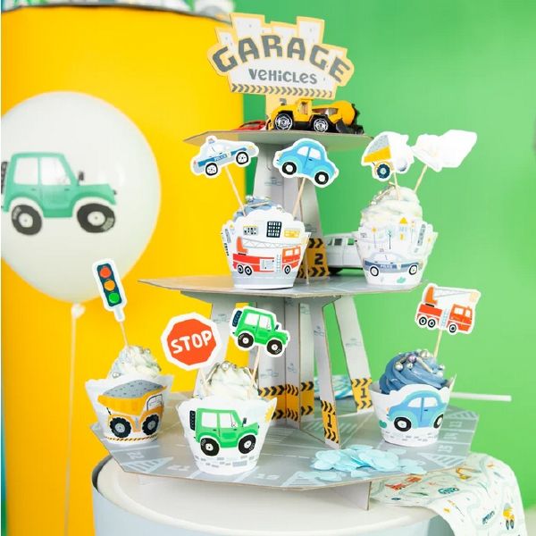 Stojan na cupcaky je skvělý nápad na praktickou dekoraci stolu, zvláště když slouží jako garáž na cupcaky v košíčkách s auty. Na ní umístěné muffiny vytvoří kompozici, kterou budete chtít jíst i očima. A pohled na živé barvy přitáhne pozornost malých účastníků večírku a vykouzlí jim úsměv na tváři.