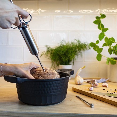 Představujeme praktický, inovativní a snadno použitelný způsob, který umožňuje profesionální nakládání masa a uzenin pomocí láků a marinád doma. Postarejte se o lahodnou chuť, jemnost a delší trvanlivost masných výrobků s pomocí této stříkačky. Díky svému designu a dvěma typům jehel je příprava masa k tepelné úpravě bude ještě snazší a rychlejší.