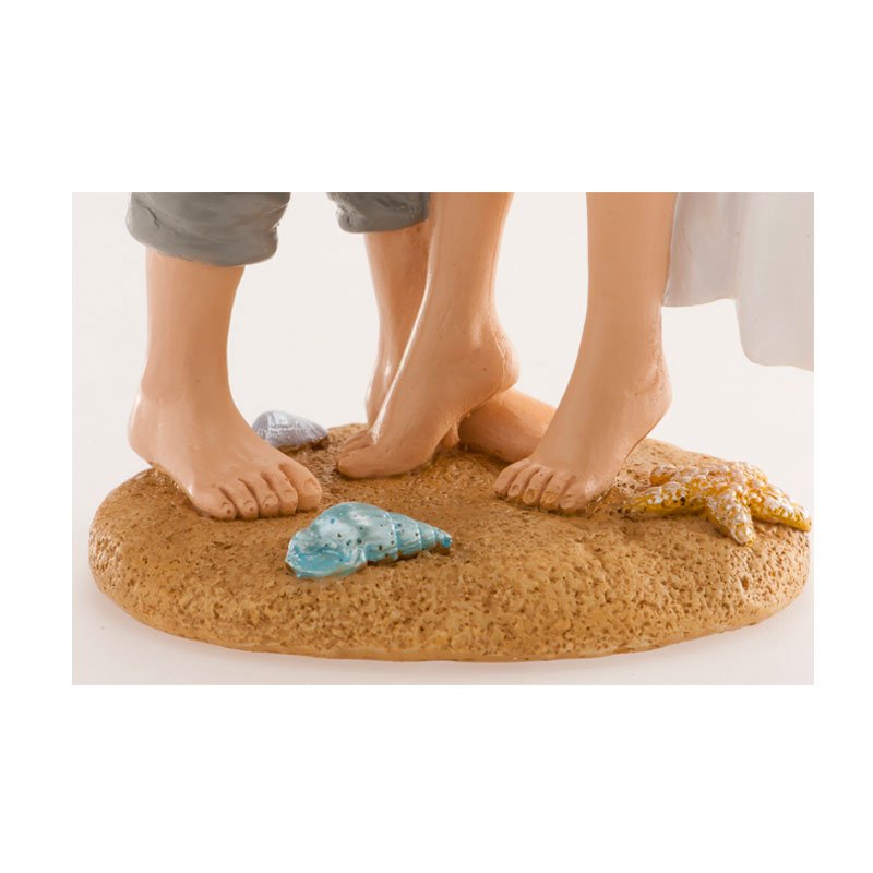 Elegantní sváteční ozdoba je ideální pro zdobení svatebních dortů. Svatební figurka je jednoduché a elegantní řešení pro zdobení dortů. Hlavními postavami této dekorativní figurky vyrobené z pryskyřice jsou čerství novomanželé, kteří stojí na pláži při polibku. Vyznačuje se spontánním, zábavným a elegantním stylem. Splňuje všechny požadavky evropských norem a je vhodná pro styk s potravinami. Výrobek je vhodný pro profesionální použití v cukrárnách. Tato nejedlá dekorace se dá využívat opakovaně, můžete si ji schovat jako vzpomínku na váš svatební den. Výška 16 cm.