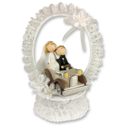 Nejedlá dekorace v podobě svatebního páru sedícího v autě. Nevěsta s ženichem jsou vyvedeni v klasických barvách, mají černý oblek a bílé svatební šaty. Rozměry sošky jsou 18 x 220 mm. Sošku lze použít na svatební dort patrový, atypický i na zcela jednoduchý. Není potřeba žádná složitá příprava. Díky pevné základně bude držet přesně na svém místě. Soška je vyrobena z pevného plastu, doplněná něžným tylem, je zdravotně nezávadná a dobře omyvatelná.