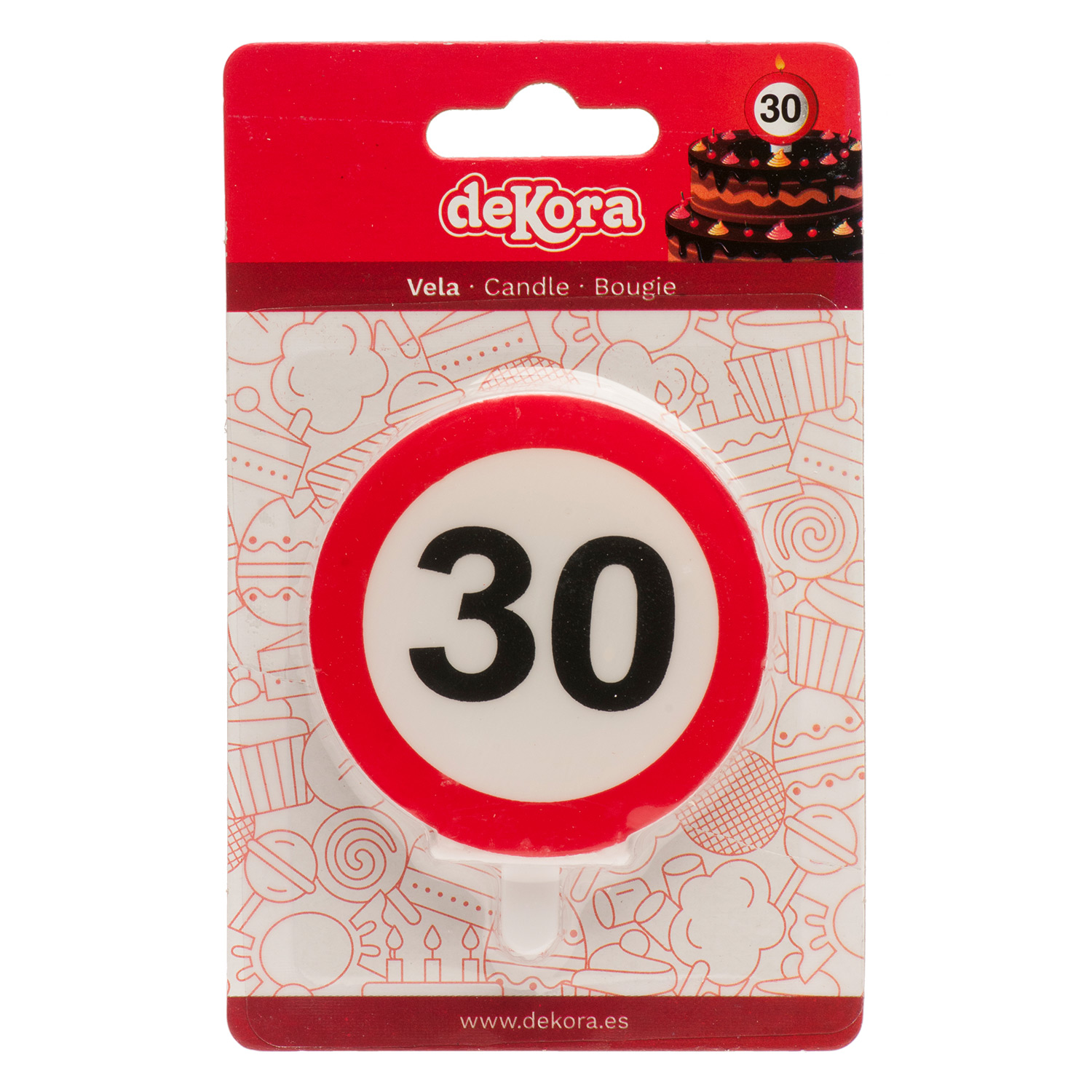 Dokončete své narozeninové oslavy s touto 30 označenou svíčkou od deKora.Tato svíčka má motiv zákazové cedule, se kterou můžete dát narozeninovému dortu originální nádech. Velikost 6,3 cm.