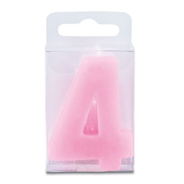 Svíčka ve tvaru číslice 4, růžová barva, výška 4 cm. Je vhodná především pro zdobení narozeninového dortu a podobných moučníků. Svíčka splňuje všechny bezpečnostní předpisy.