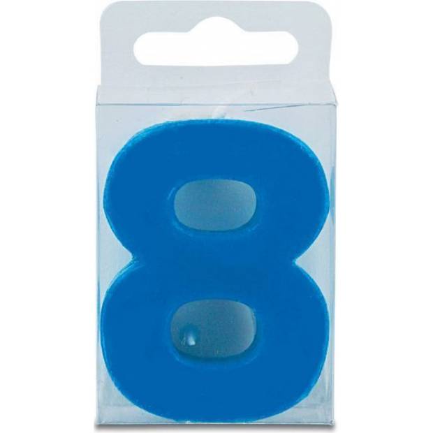 Svíčka ve tvaru číslice 8, modrá barva, výška 4 cm. Je vhodná především pro zdobení narozeninového dortu a podobných moučníků. Odpovídá všem bezpečnostním předpisům.