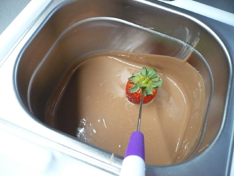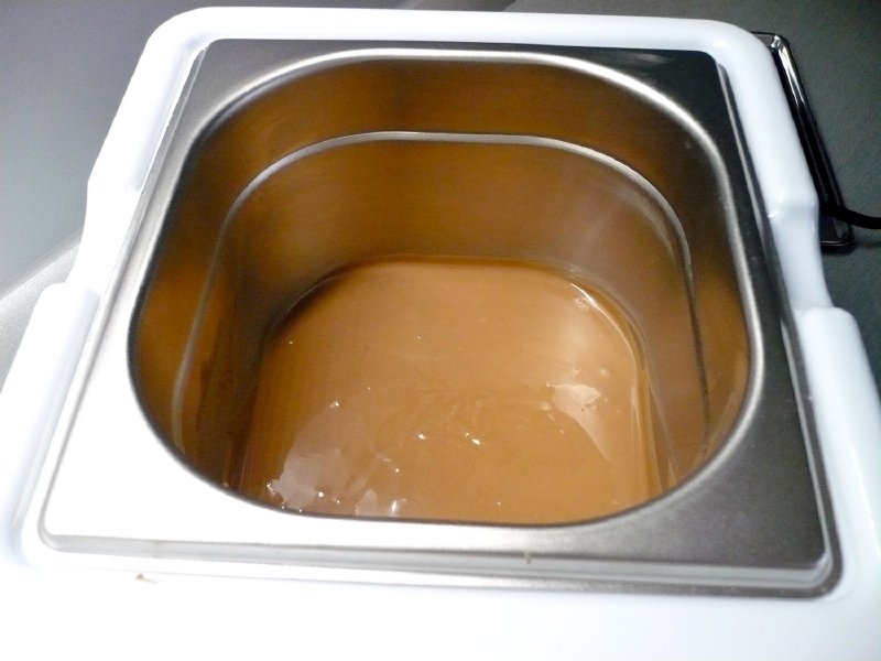 Do nádoby přístroje vložíme zhruba dvě třetiny čokolády z celkového množství, nejraději ve tvaru čoček. Jinak je třeba čokoládu nalámat nebo nasekat na malé kousky. Přikryjeme víkem a nastavíme teplotu na 45°- 50°C. Rozpuštěná čokoláda by měla dosahovat maximálně teploty 45°C. Proces kontrolujeme teploměrem. Při rozpouštění občas zamícháme. Doba rozpuštění závisí na celkovém množství čokolády. Pak na přístroji nastavíme teplotu dle použitého druhu čokolády. U bílé čokolády to je 28–29°C, u mléčné 30-31°C a u hořké 31-32°C. Nádobu vyjmeme z přístroje a rozpuštěnou čokoládu rychle zchladíme – temperujeme, přidáním další čokolády. Stále mícháme až do rozpuštění, teplotu kontrolujeme teploměrem. Čokoládu přidáváme po částech a vždy dobře vymícháme, až do dosažení potřebné teploty dle druhu. Nádobu vložíme zpět do přístroje, který nám bude požadovanou teplotu udržovat a můžeme s čokoládou začít pracovat.