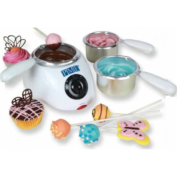 Temperovací stroj na čokoládu pracuje s vodní lázní, udržuje čokoládu při optimální teplotě, aby netuhla. Lze použít také na horké ovoce a další pokrmy.  Temperovací stroj je včetně 3 mísek na rozehřátí čokolády.