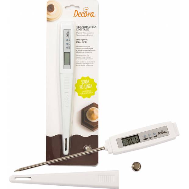 Přikládací cukrářský teploměr je přesný elektronický přístroj pro detekci teploty aktuálně měřené čokolády či jiné potraviny. Baterie je součástí balení. Tento teploměr by neměl chybět v základní výbavě žádného profesionálního cukráře. Maximální měřená teplota je až 300 stupňů Celsia. Teploměr je velice přesný.