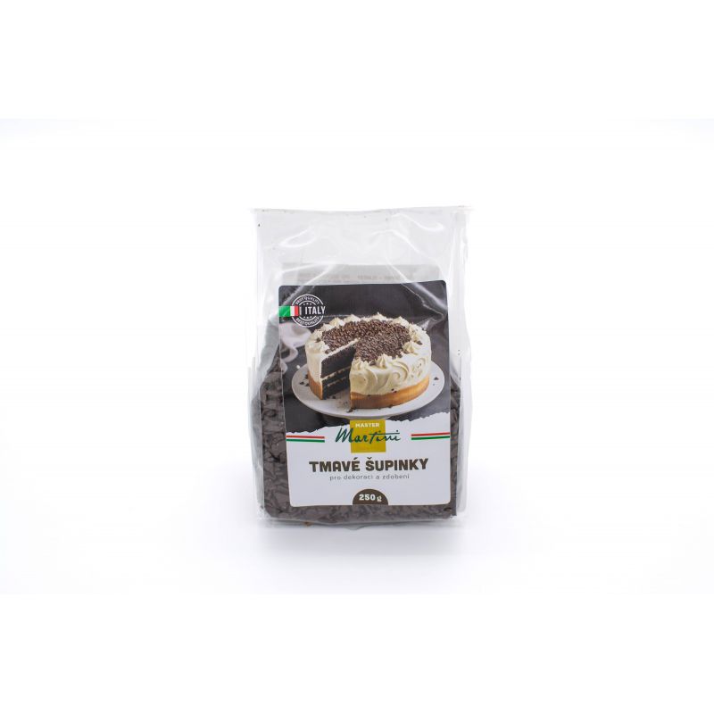 Tmavé čokoládové šupinky Master Martini dodají každému dortu i dezertu elegantní vzhled a dokonale čokoládovou chuť.