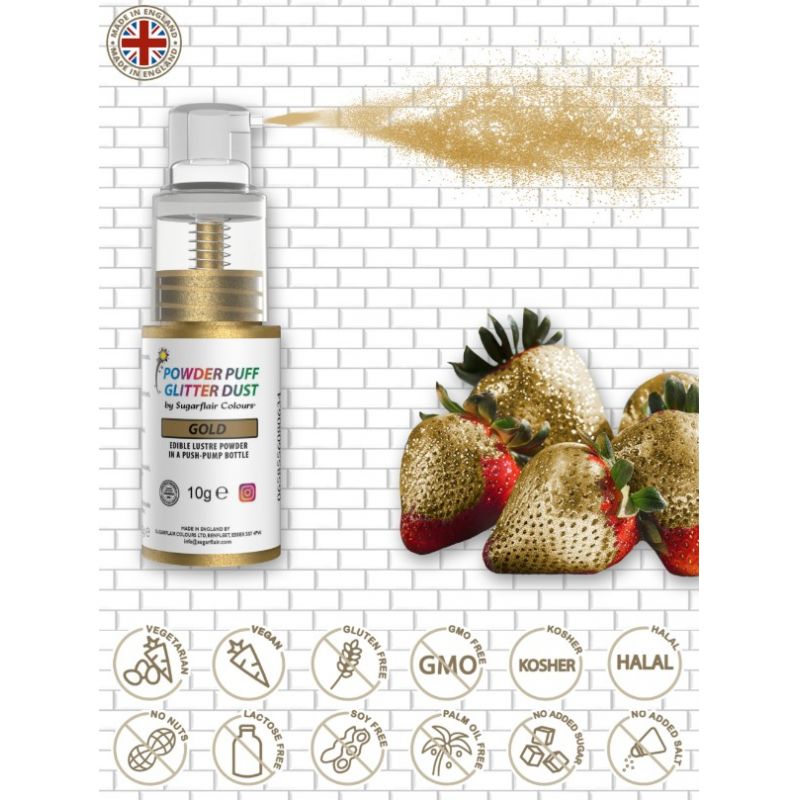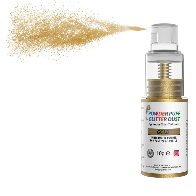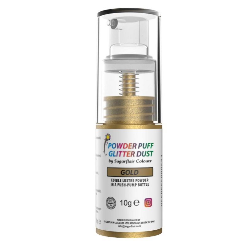 Dokončete své cukrářské výtvory tímto třpytivým práškem Sugarflair ve zlatém pumpičkovém spreji, který dodá dezertům luxusní a elegantní vzhled. Díky praktickému balení se sprej velmi snadno používá a umožňuje rovnoměrné nanášení jemného zlatého lesku bez nutnosti dalšího náčiní. Je ideální pro zdobení muffinů, dortů, zákusků, cupcakes, čokoládových dekorací, modelovaných ozdob i dalších sladkých detailů, kterým chcete dodat slavnostní akcent a profesionální vzhled. Zlatá barva působí výrazně, ale zároveň jemně, a skvěle se hodí pro svatební, narozeninové, vánoční i slavnostní dorty. Sprej neobsahuje oxid titaničitý, pracuje pouze se vzduchem a neobsahuje alkohol, takže je vhodný pro široké použití v cukrářské tvorbě. Produkt je košer certifikovaný a obal je vyroben z materiálů bezpečných pro styk s potravinami. Doporučené maximální množství je 2 g lesklé barvy na 1 kg dortu a dekorací. Čistý obsah balení je 10 g. Použití je velmi jednoduché – sprej držte přibližně 10 cm od zdobeného povrchu a opakovaným stiskem pumpičky nanášejte barvu, dokud nedosáhnete požadovaného efektu. Výsledkem je jemný, rovnoměrný třpyt, který promění každý dezert v skutečnou ozdobu slavnostního stolu. Skladování: skladujte v uzavřených nádobách na suchém místě. Výrobek není ovlivněn běžnými teplotními výkyvy.