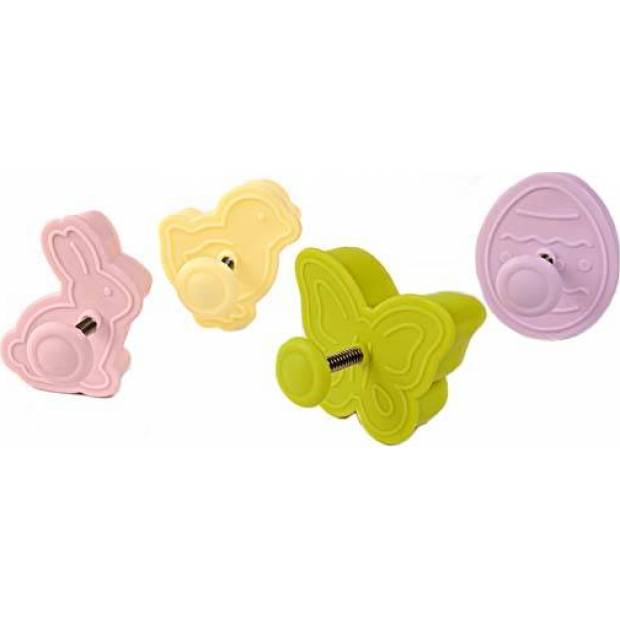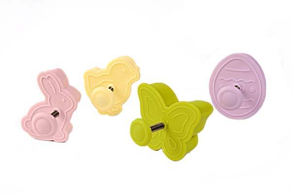 Sada vykrajovátek, se kterými vykrojíte cukroví a zároveň na něj otisknete vzorek. S vykrajovátky s pístem můžete vykrojené kousky přenést na plech a potom stlačením pístu vykrojený kousek z vykrajovátka snadno vyloupnete. V této sadě najdete čtyři vykrajovátka z pevného krásně barevného plastu s velikonoční tématikou.