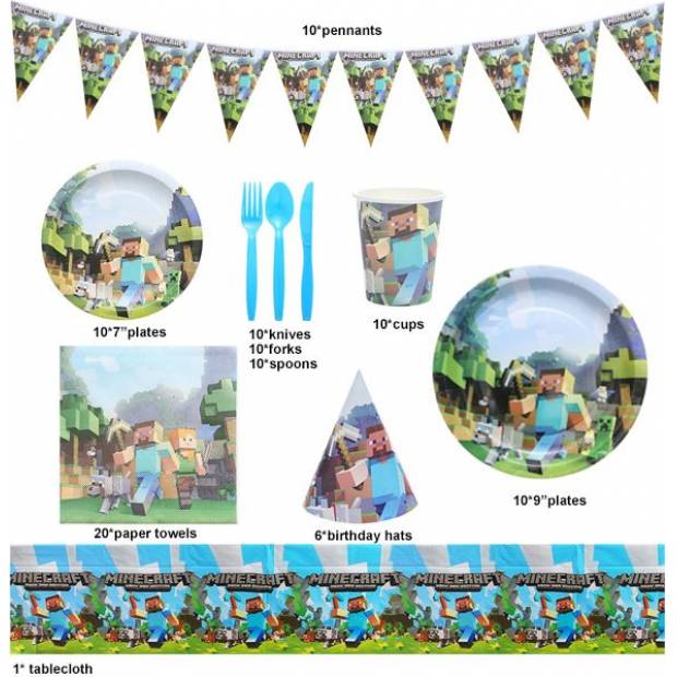 V tomto setu najdete ubrus,10 talířů, 10 příborů, 20 papírových ubrousků, 10 papírových kelímků, 6 narozeninových čepic, 10 menších papírových talířů, vlaječkové girlandy. Super praktická sada společenského nádobí s motivem Minecraft: všechny talíře, ubrousky a kelímky jsou vyrobeny z vysoce kvalitního odolného papíru a snadno pojme jakýkoli druh jídla nebo pití, aniž by vytekly. Jsou dostatečně robustní, aby je bylo možné používat i mimo stůl. Narozeninový set byl jedinečně navržen tak, aby obohatil nejen dětské sny a poskytl jim fantastické překvapení. S originálními kreslenými vzory vypadají tyto talíře, šálky a další dekorace naprosto úchvatně. Jedná se o skvělý výběr doplňků pro narozeninovou oslavu. Snadné použití vám zajistí rychlý úklid po večírku. Vhodné pro mnoho příležitostí: Potřeby pro narozeninovou oslavu s libovolným motivem lze použít pro různé příležitosti, jako jsou dětské oslavy, narozeniny, Vánoce, svatby, pikniky, tématické večírky a rekvizity pro fotobudky, atd.