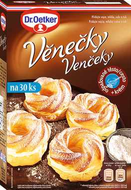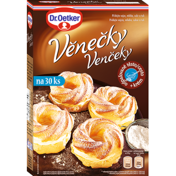 Směs na přípravu věnečků od Dr. Oetkera obsahuje vše potřebné na přípravu odpalovaného těsta a krému. Vyrobit si své vlastní chutné věnečky tak zvládne i začátečník. Stačí přidat vejce, mléko, cukr a máslo a snadno vytvoříte 30 ks nadýchaných věnečků. Lahodný zákusek na nedělní odpoledne provoněné vanilkou.
